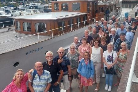 Maar liefst vijfendertig deelnemers van Patiëntenvereniging Hoofd-Halskanker varen vandaag mee. Het merendeel van de gasten is al aan boord als ik via de loopbrug de Piet Hein betreed. Het is voor mij het vierde jaar op rij dat ik deze dag organiseer waardoor een dag varen met Vaarkracht en de leden van onze Patiëntenvereniging voor mij voelt als een reünie.